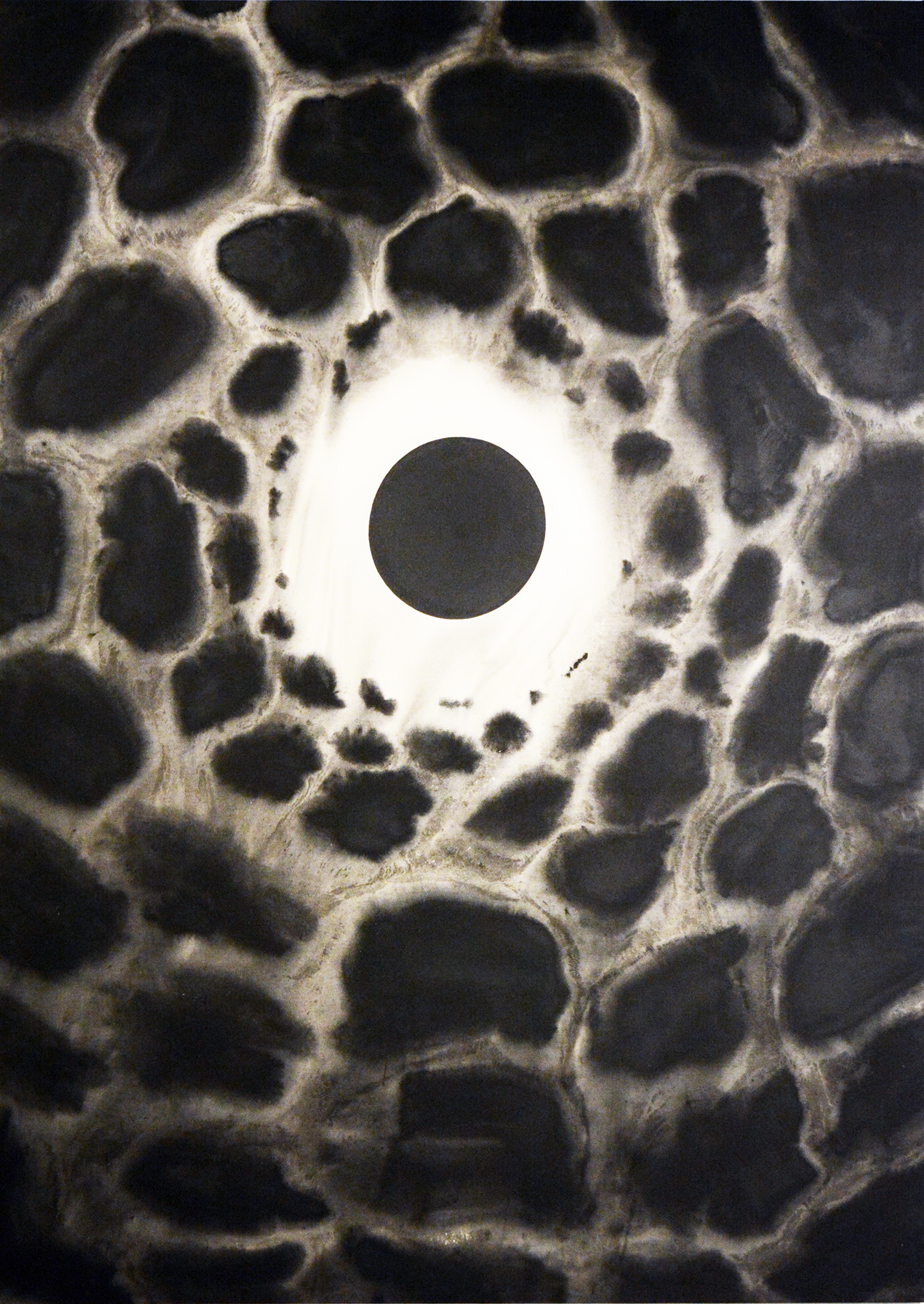 A solo exhibition titled Black Sun features a visual artist, Willie Binnie. The artist, based in Williamstown, MA, presents large-scale canvases as well as small watercolor sketches and paintings primarily of monochromatic character.