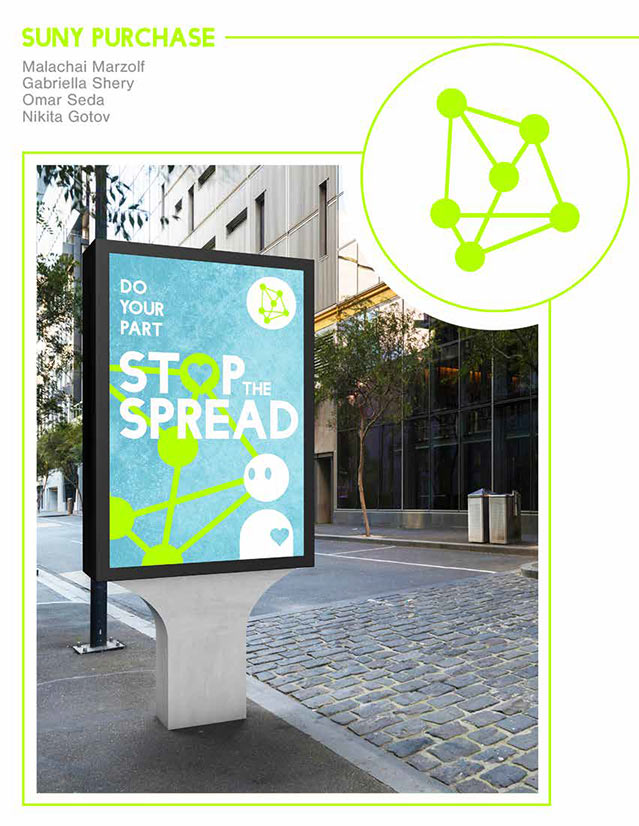 As COVID-19 continues to spread, our team wants to bring awareness and a sense of community in these struggling times. Through our logo of the green nodes, we reflect the concept of the spread of COVID-19, calling all hands to stop the spread. Also through this logo and the use of the symbol in the composition, our team encourages connection in a time that feels extremely isolating. It takes a village to stop this spread, and our team wants to fuel the community effort it will take and that we are all in this together. Together we can stop the spread and keep our communities safe.