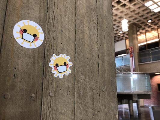 For the campus COVID-19 safety campaign, I decided to create an icon that resembled the familiar emoji. I believe that this is successful for my audience of college students since the majority of them recognize and use emojis. I went with yellow as that is the default emoji face color, with red cheeks to make it livelier. The emoji is stylized in my own way, so it does not copy the exact emoji structure. Instead of having the regular round shape of the head, I added rounded spikes around the circle to make it resemble the structure of the coronavirus. A mask is covering the mouth of the emoji to represent the importance of wearing a mask. This design is both playful and successful in convincing others to follow guidelines by wearing a mask or some sort of face covering. I implemented this design by creating stickers of it. It can both be cut as a perfect circle or cut to follow the contour of the design. My example shows the stickers placed on a pillar in the Tower Fine Arts building at SUNY Brockport. Although I represented my design through a sticker, it can also be used as a graphic on a t-shirt, hat, poster, and many other implementations. This was a fun project to work on and I am happy with the solution I created.