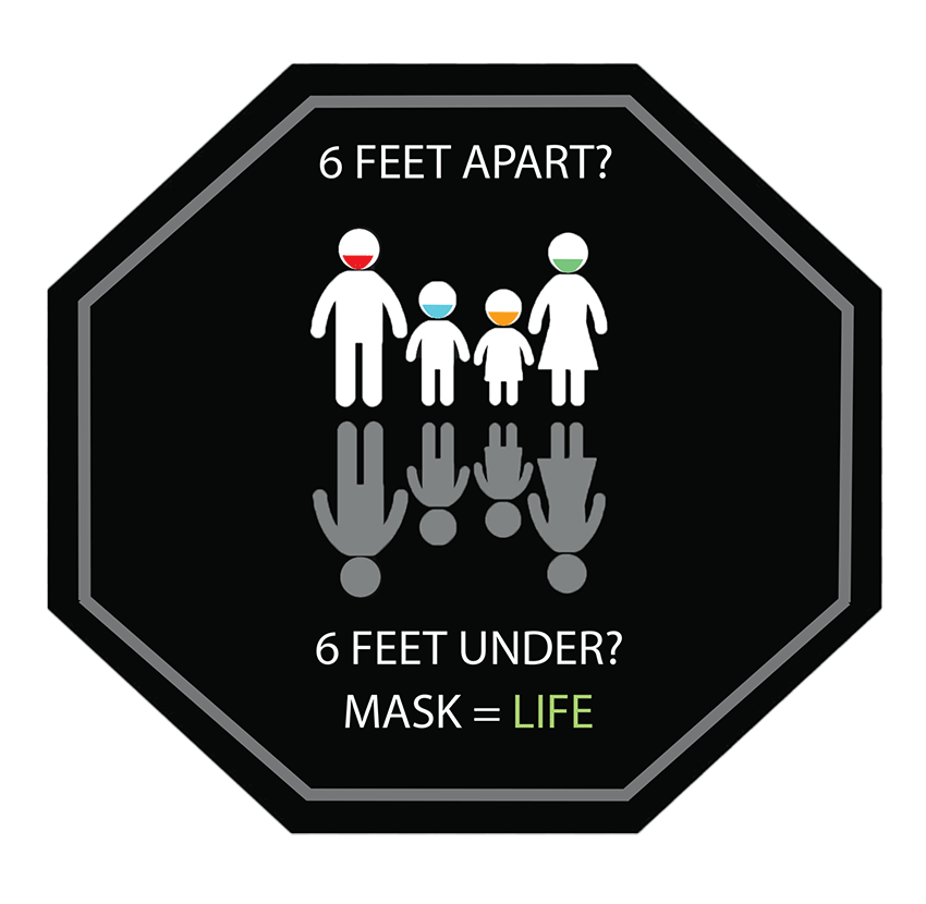 I began with an octagon shape because I knew viewers would associate it with a stop sign, and therefore catch their attention. I decided on black because it is both bold and warning color when paired with the correct message. I chose the white icons in contrast to the gray “reflection” to illustrate what could happen if one does not wear a mask and socially distance. I think the final result is blunt and visually effective.