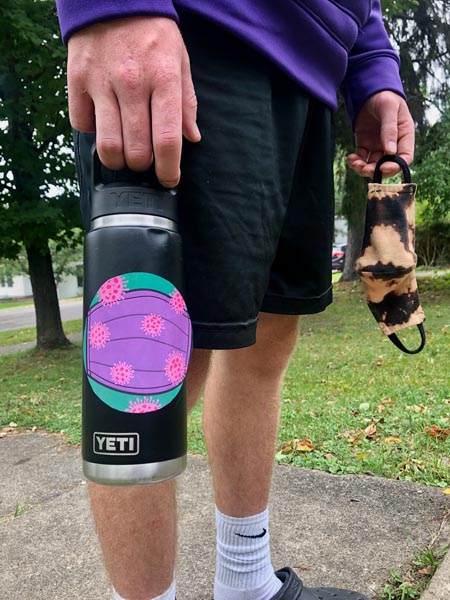 This is a sticker I have created for reusable water bottles that serves, all day, as a reminder to wear a mask.