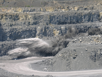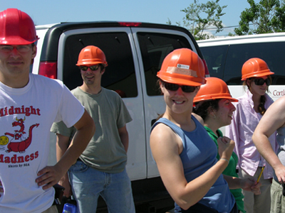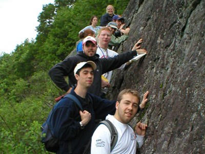 Sarken, Andy, Nate, Rob, Leslie, James, Mike, Stephanie and Bethany putting there noses to the crinoidal grainstone.