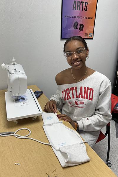 More creativity followed. The crochet club’s workshop last spring used the fiber arts wall packed with yarn skeins donated by the Art and Art History Department. School of Education students now produce customized t-shirts in preparation for their teaching semester. The button-making machines give students a quick way to produce a free giveaway with a catchy message. One especially “crafty” student used the space’s sewing machine to turn a hooded sweatshirt into an off-the-shoulder affair complete with a matching tube top, converted from the hood.